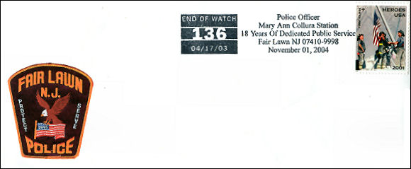 In 2006, the Fair Lawn Auxilary Police redesigned their uniform shoulder patch. The new design includes the number 136 in purple stitching to rememberMaryAnn who started her law enforcement career as an auxillary police officer before joining the main force. Pictured below is the Auxillary Police Chief presenting a plaque with the new patch to MaryAnn's mother.